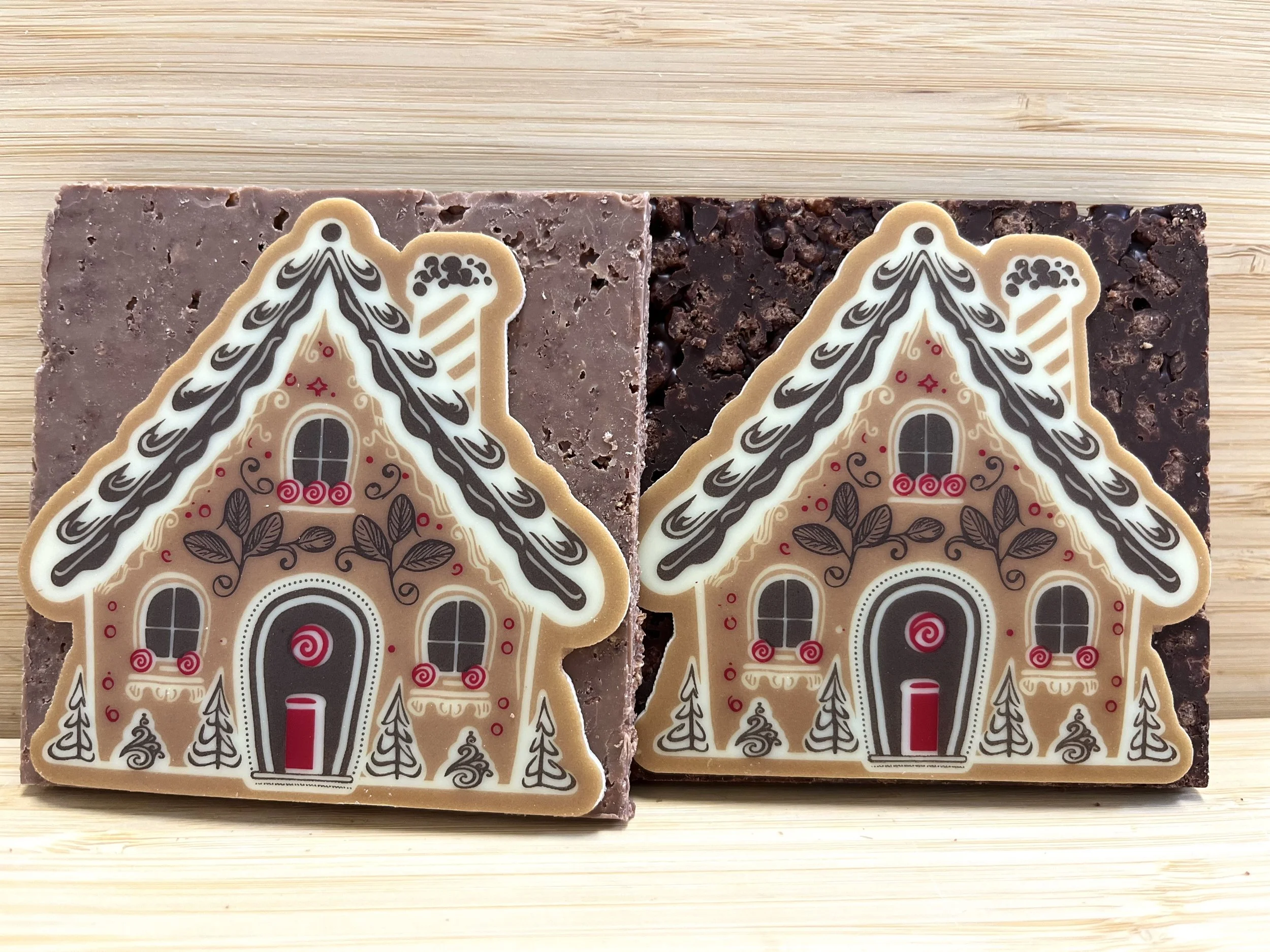 chocolat noir 64% ou chocolat lactée et décor chocolat blanc, garni de riz soufflé cacao, Sucre, beurre de cacao, lait entier en poudre, fèves de cacao, émulsifiant: lécithine de tournesol.extrait naturel de vanilleAllergène : Fabriqué dans un atelier qui utilise du lait. Présence possible de: fruits à coque, soja, gluten, oeuf, sésame, lait