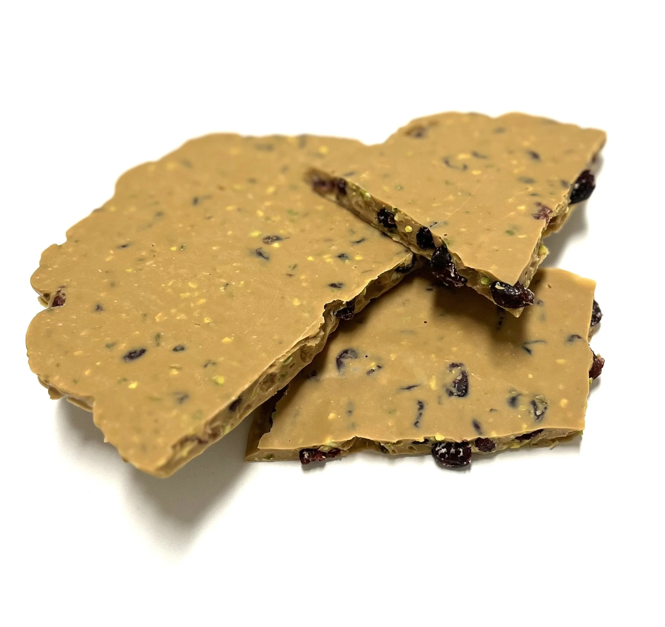 Composition : chocolat dulcey . Sucre, beurre de cacao, beurre, lait entier en poudre, fèves de cacao, émulsifiant: lécithine de tournesol.extrait naturel de vanille , Cranberry, pistache