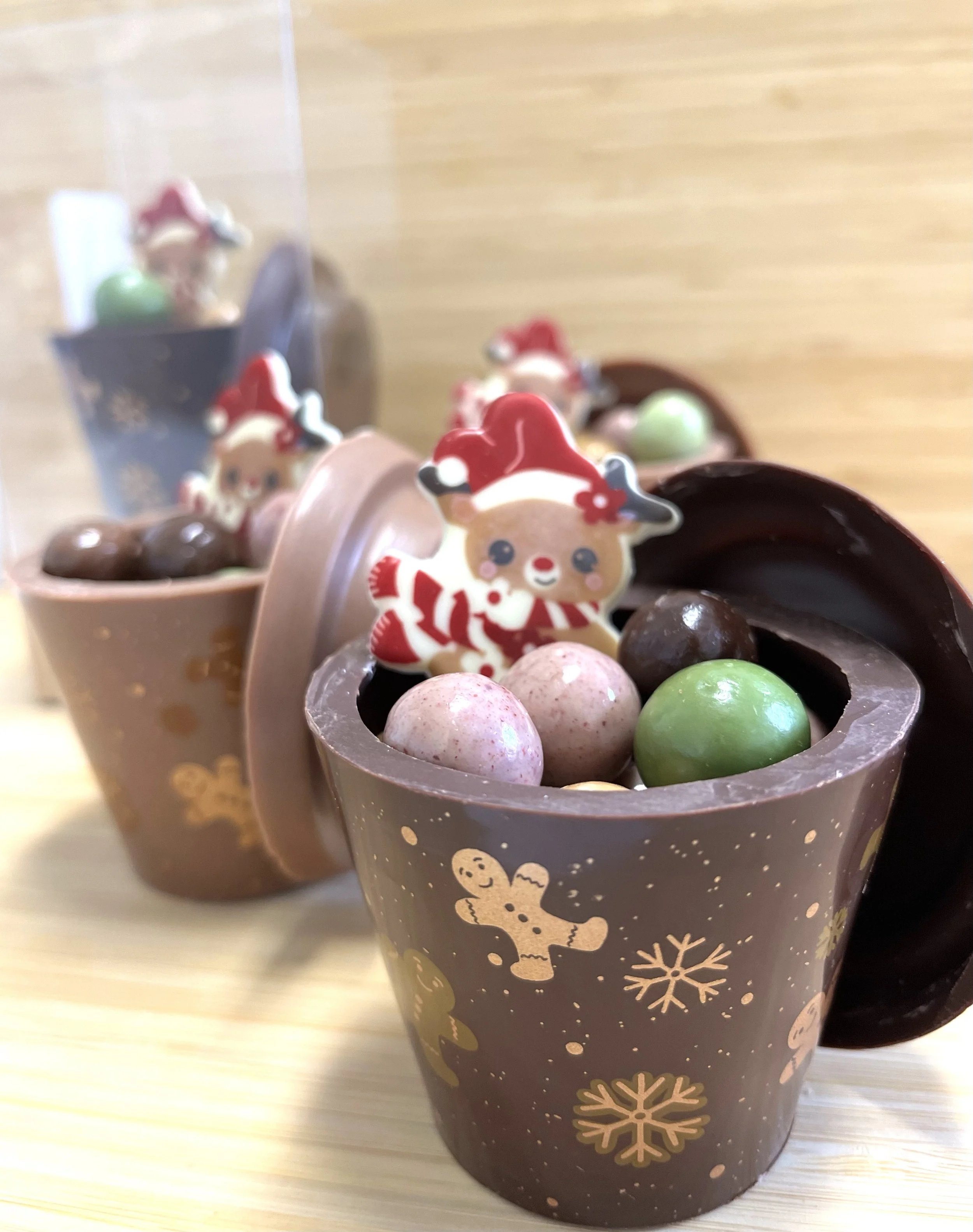 Disponible en Chocolat LaitGarniture : Chocolat noir 66% ou chocolat lactée, sucette dulcey décorée garni sucre pétillant, garniture Croustibilles de blé soufflé enrobé de chocolat noir, lait ,dulcey et framboise, Billes Noisettes/ , beurre de cacao, beurre, lait entier en poudre, fèves de cacao, émulsifiant: lécithine de tournesol. Extrait naturel de vanille